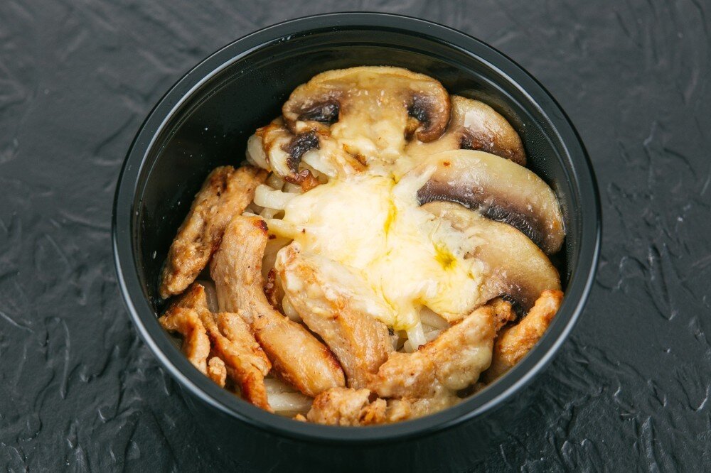 Лапша пшеничная, курица, шампиньоны, сыр, сливки, чеснок, соевый соус