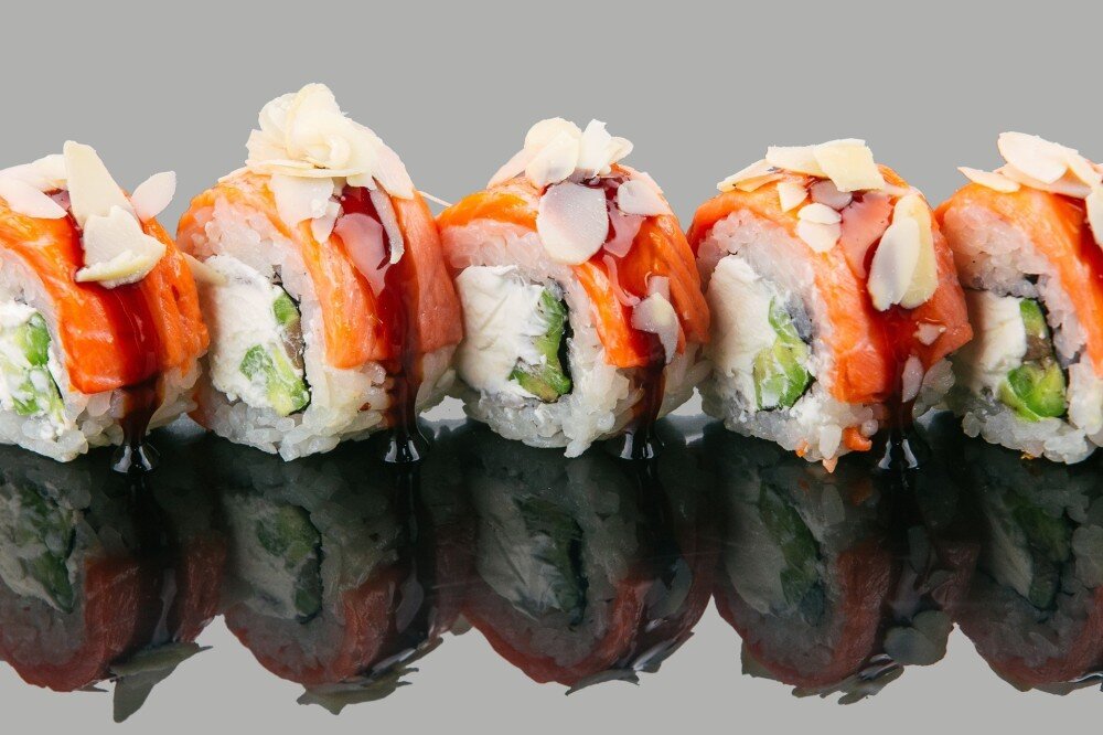 Рис, водоросли нори, творожный сыр, авокадо, филе лосося, соус унаги, миндаль (8 шт)