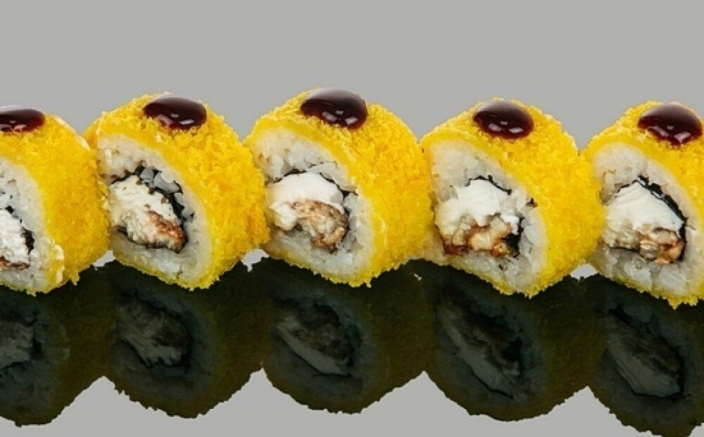 Рис, водоросли нори, творожный сыр, угорь копченый, соус унаги, сухари панко, кляр (8 шт)