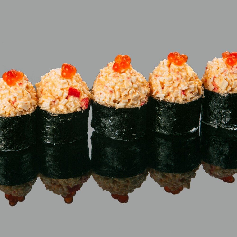 Водоросли нори, сыр творожный, красная икра, краб, соус спайси (8 шт)