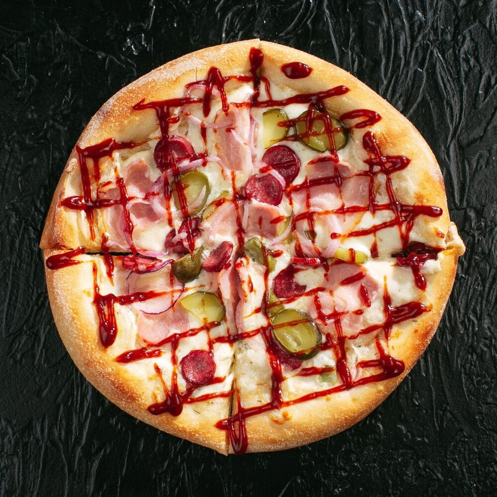 Тесто для пиццы, бекон, охотничьи колбаски, огурчики-корнишоны, лук репчатый, сыр моцарелла, фирменный соус BBQ, соус тоба (25 см)