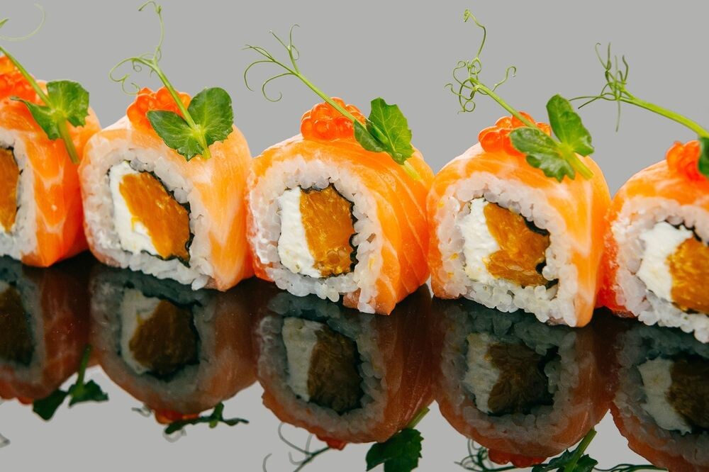 Рис, водоросли нори, свежий лосось, сыр творожный, мандарин маринованный, красная икра, микрозелень (8 шт)