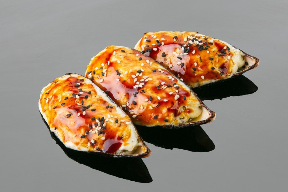 Мидии "Гигант", соус чесночный, соус для запекания, соус унаги, кунжут белый, кунжут черный