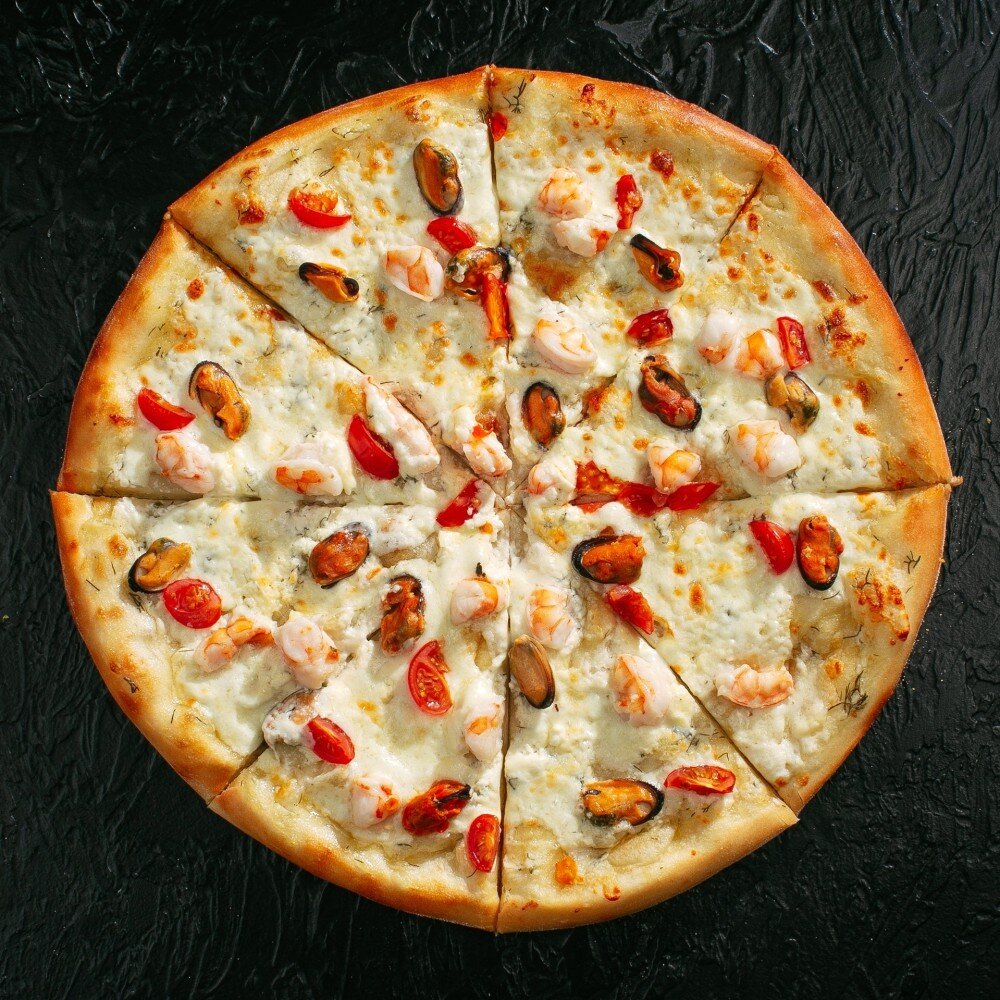 Тесто для пиццы, сыр моцарелла, креветки, мидии, помидоры черри, соус тоба (34 см)