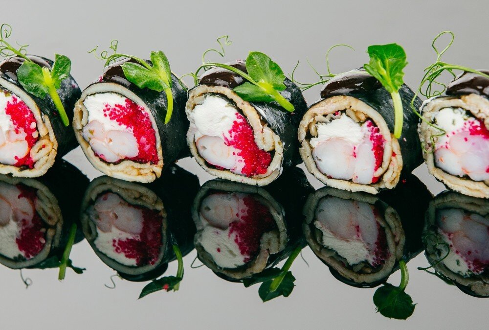 Водоросли нори, тунец жареный, креветка тигровая, сыр творожный, икра масаго красная, соус BBQ с черносливом, микрозелень гороха (8 шт)