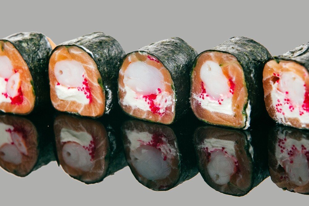 Водоросли нори, свежий лосось, креветка тигровая, сыр креметте, огурец, икра масаго красная (8 шт)