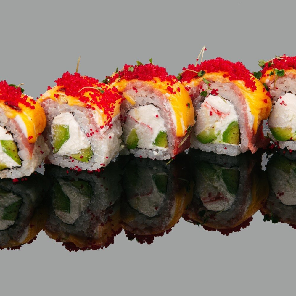 Водоросли нори, сыр творожный, краб, авокадо, тунец, ломтевой сыр, икра красная, руккола (8 шт)