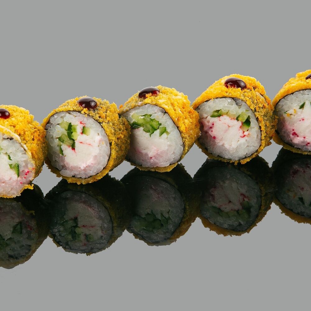 Водоросли нори, рис, соус лава, краб, огурец, фирменный кляр, соус унаги (8 шт)