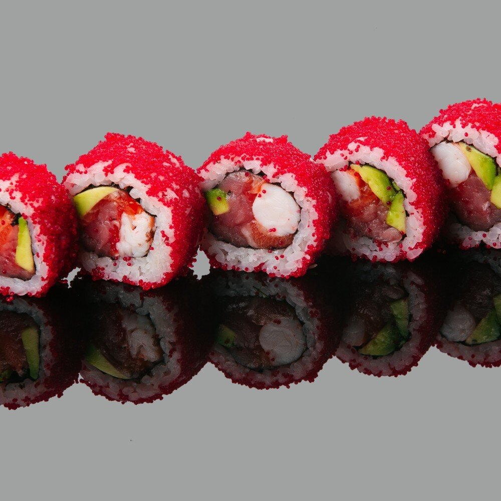 Водоросли нори, рис, тунец, лосось, тигровая креветка, авокадо, икра красная (8 шт)