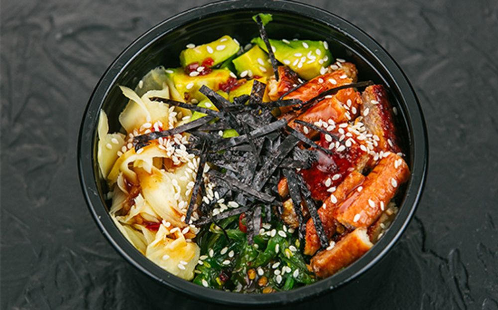 Состав: авокадо, водоросли нори, креветка, огурцы, рис для суши, семена кунжута белые, семена кунжута черные, соус для поке, соус ореховый, помидоры черри, салат чукка. Выход: 0,350 кг.