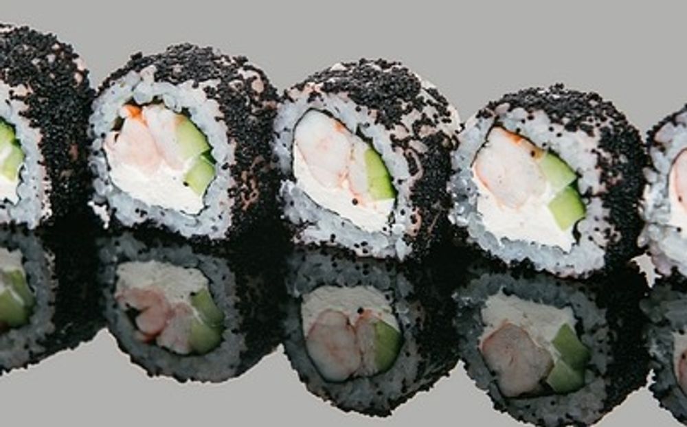 Состав: рис, водоросли нори, сыр креметте, креветки тигровые, огурец, икра масаго чёрная. Выход: 230 гр.