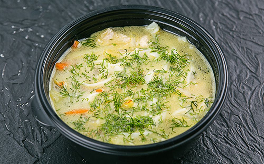 Состав: бульон куриный, картофель, грудка куриная, лапша удон, лук, морковь, перец молотый, соль. Выход: 0,370 кг.