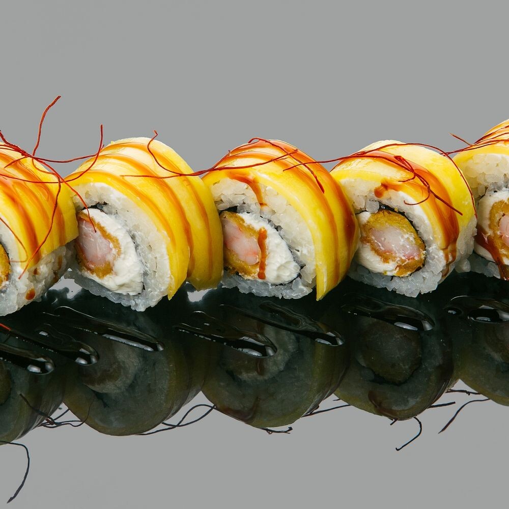Состав: рис, нори, креветка в кляре, манго, креметте, соус унаги, чили нити.
