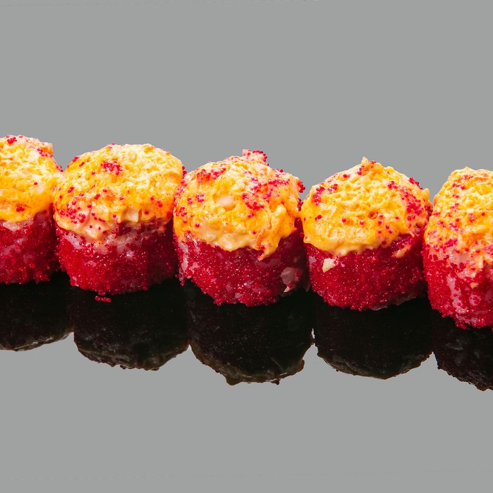 Состав: Рис, креветка, вородросли нори, творожный сыр, икра масаго красная, соус спайси.