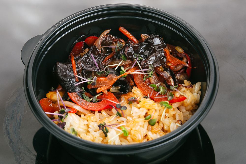 Состав: рис, овощной микс, грибы Моэр, соус терияки, соевый соус, микрозелень гороха. Выход: 300 гр.