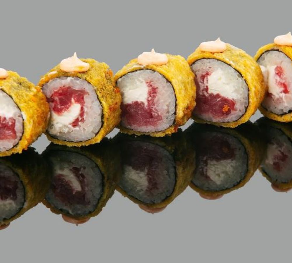 Водоросли Нори, рис, сыр творожный, тунец, кляр, сухари панко, соус спайси.
