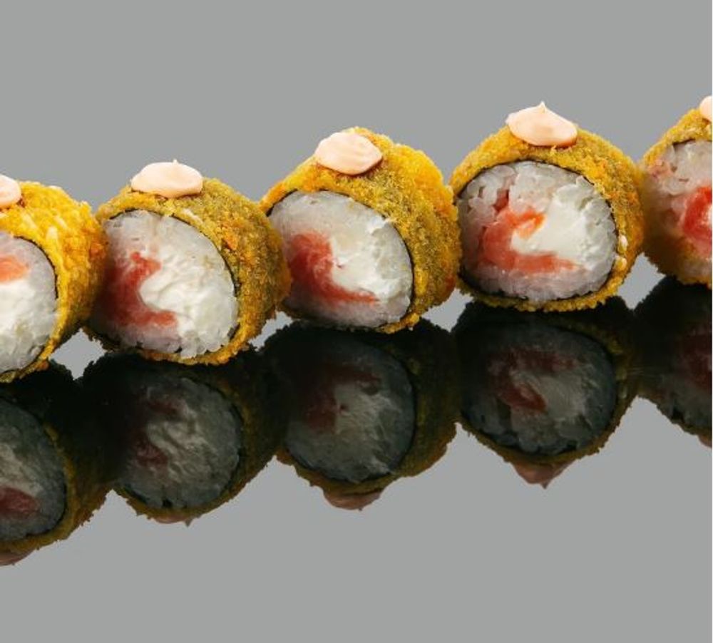Водоросли Нори, рис, сыр творожный, лосось, кляр, сухари панко, соус спайси.