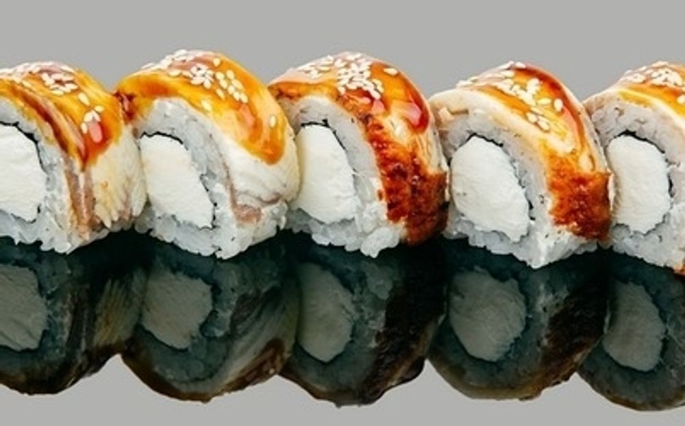 Рис, водоросли нори, творожный сыр, угорь копчёный, соус унаги, семена кунжута (8 шт)