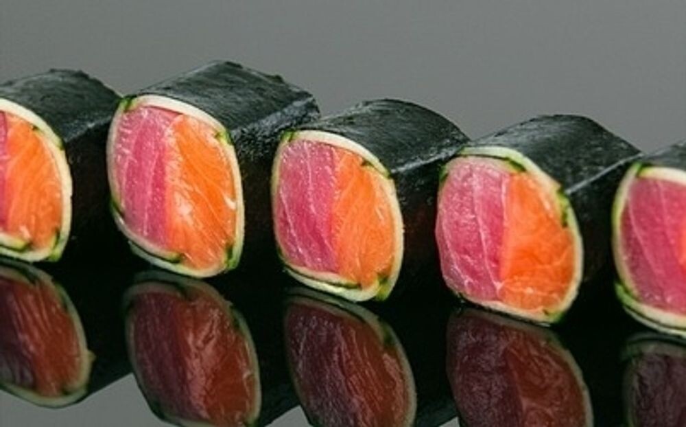Водоросли нори, свежий лосось, свежий тунец, огурец