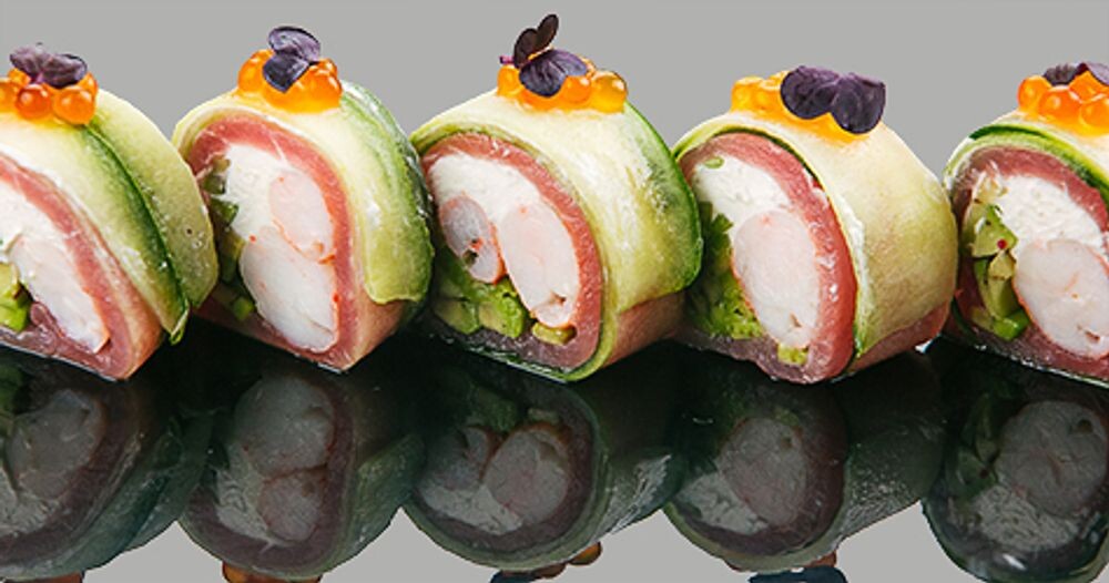 Огурец, тунец елоуфин, креветка, сыр творожный, авокадо, икра, микрозелень