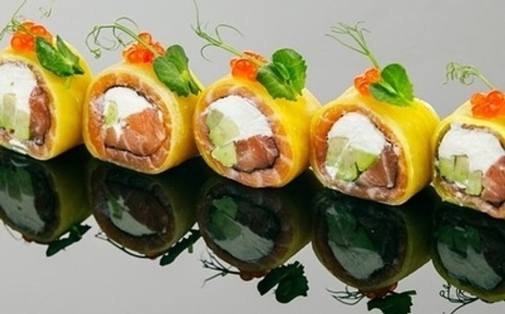 Водоросли нори, свежий лосось, такуан, сыр творожный, авокадо, икра, микрозелень гороха