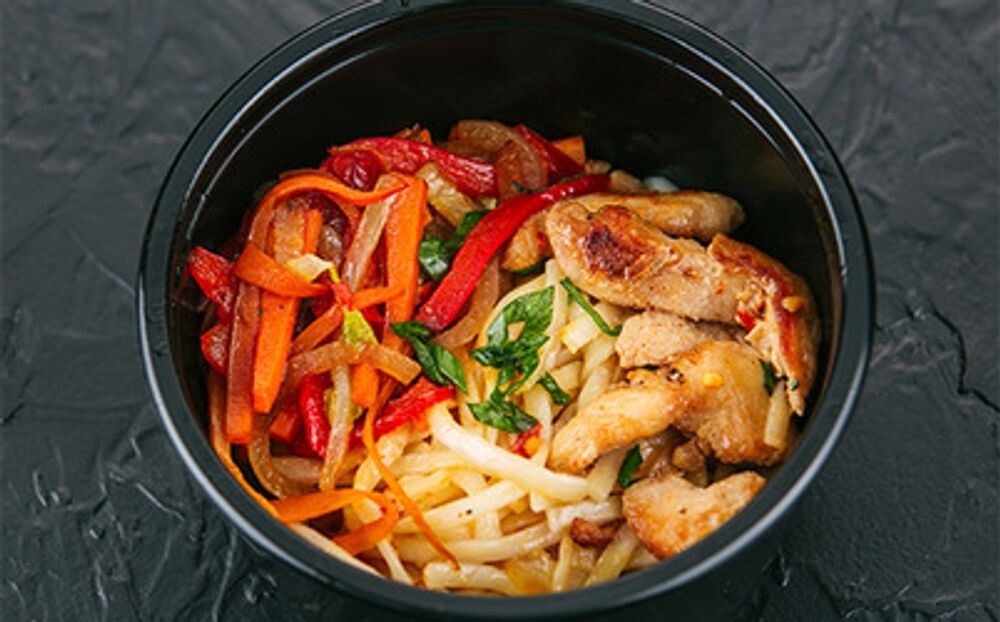 Лапша пшеничная, курица, перец болгарский, лук, морковь, пекинская капуста, зелень, соус сладкий чили, соевый соус.
