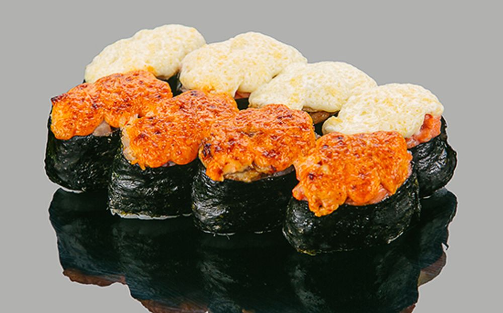 Запечённые гунканы спайси: с лососем, с тунцом, с креветкой и угрем (8 шт)