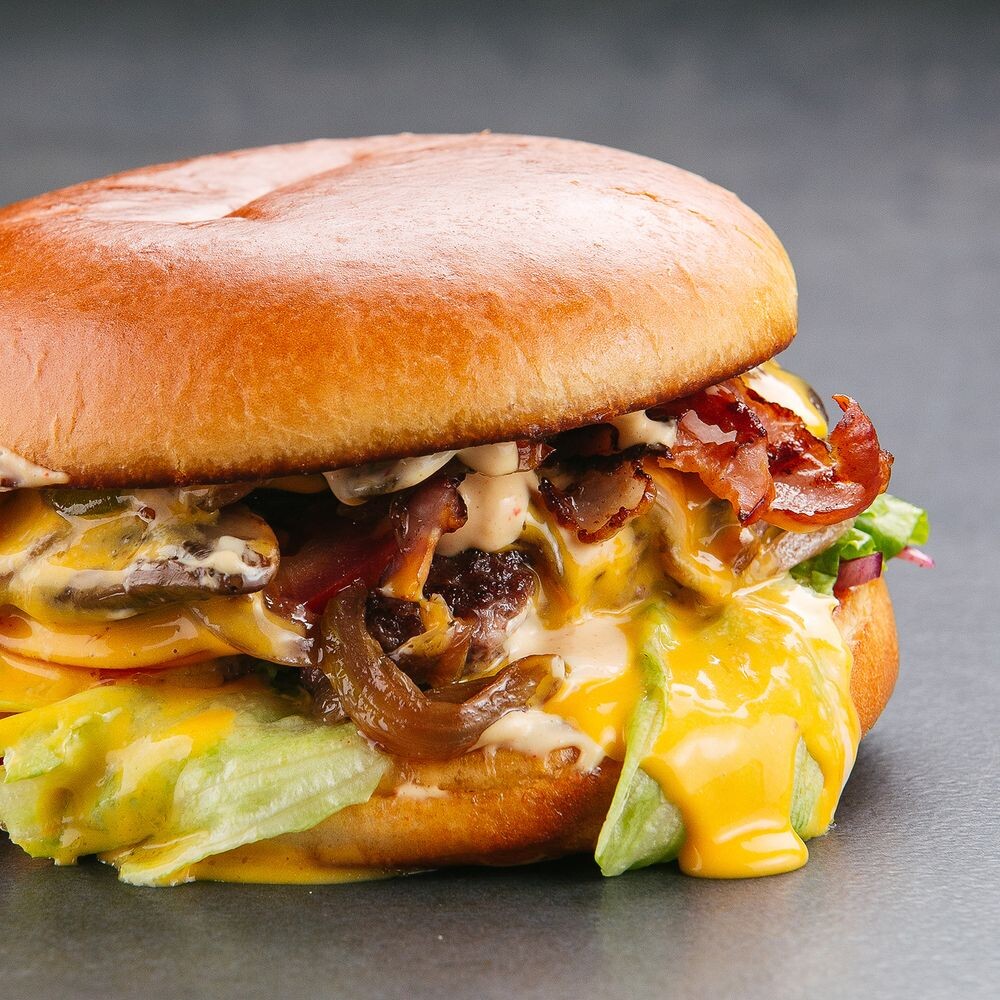 Бекон , булочка для бургера, лук красный, масло растительное, масло сливочное, помидоры, салат айсберг, соус бургер, соус сырный, фарш говяжий мраморный, чеснок, шампиньоны