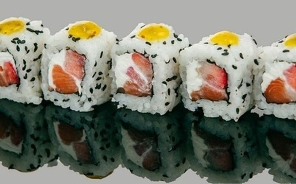 Рис, водоросли нори, клубника, свежий лосось, сыр творожный, семена кунжута чёрные, соус ананасовый чили (8 шт)