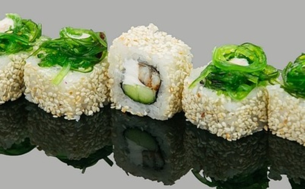 Состав: рис, водоросли нори, сыр креметте, водоросли чука, угорь копченый, огурец, соус ореховый. Выход: 290 гр.