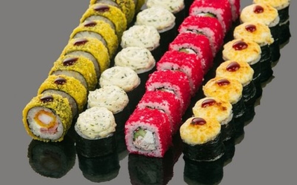 Состав: ролл «Запечённый с мидиями», ролл «Сёгун», ролл «Калифорния со снежным крабом», ролл «Кобан». (32 шт.) Выход: 1020 гр.