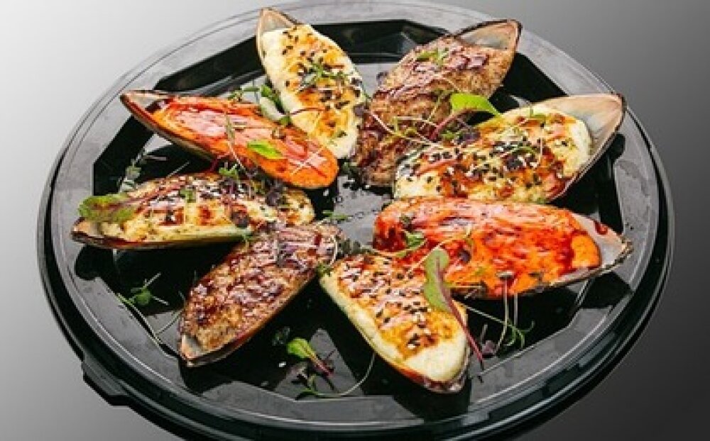 Состав: мидии в створках, соус грибной, соус запеченный, соус спайси, микрозелень. Выход: 390 гр.
