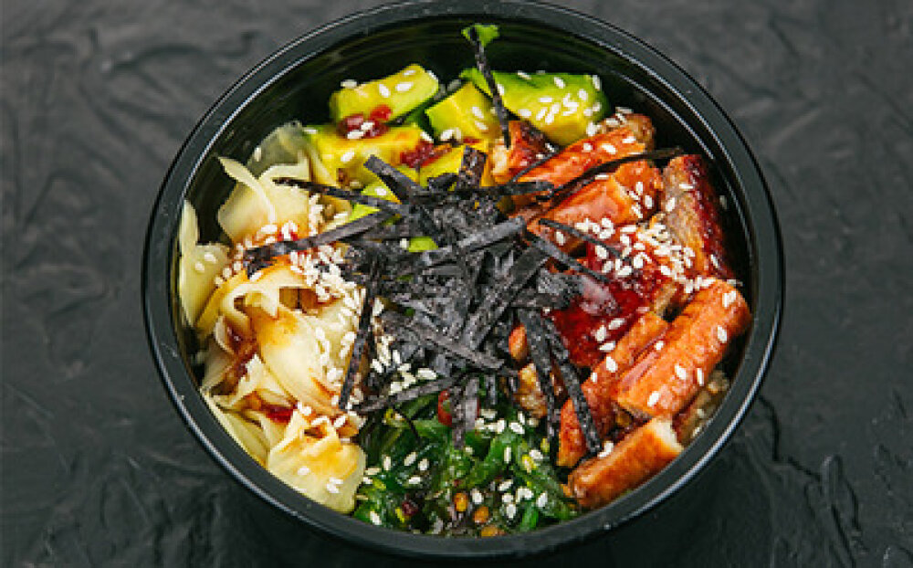 Состав: рис, угорь копченый в фирменном соусе, авокадо Хасс, водоросли чука с ореховым соусом, имбирь, кунжут, водоросли нори. Выход: 310 гр.
