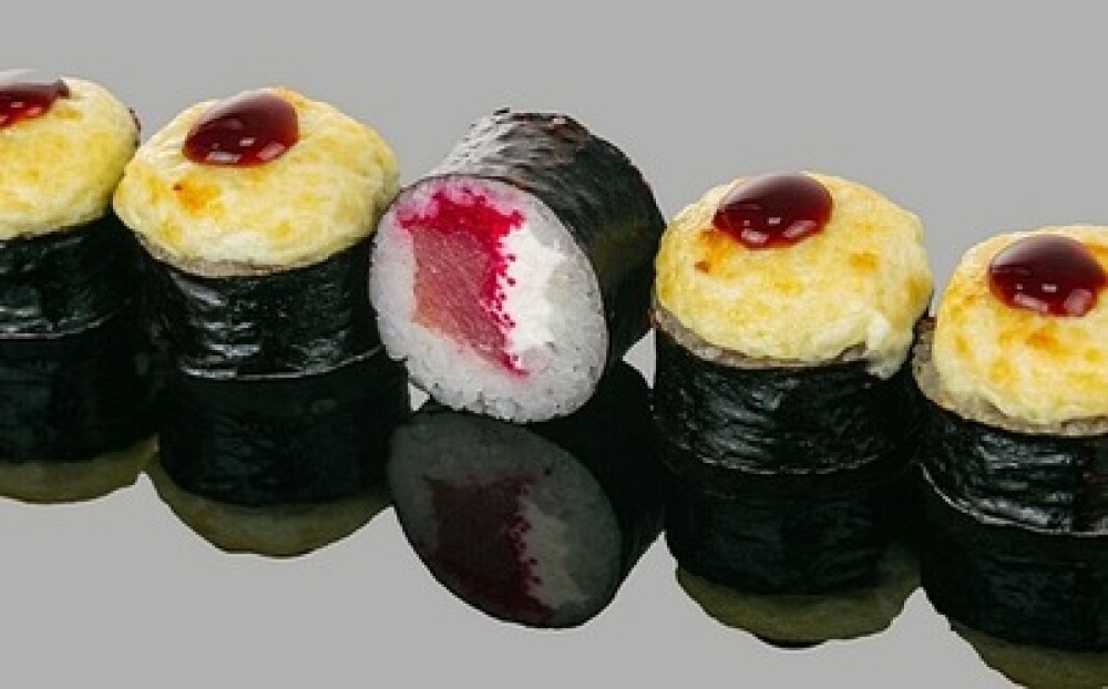 Состав: рис, водоросли нори, сыр креметте, свежий тунец, икра масаго красная, соус запеченный, соус унаги. Выход: 290 гр.
