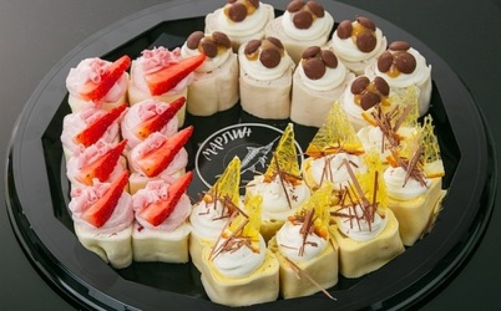 Состав: десертные роллы "Ягодный мусс", "Манговый мусс" и "Шоколадный мусс" в подарочной упаковке. (32 шт.) Выход: 860 гр.