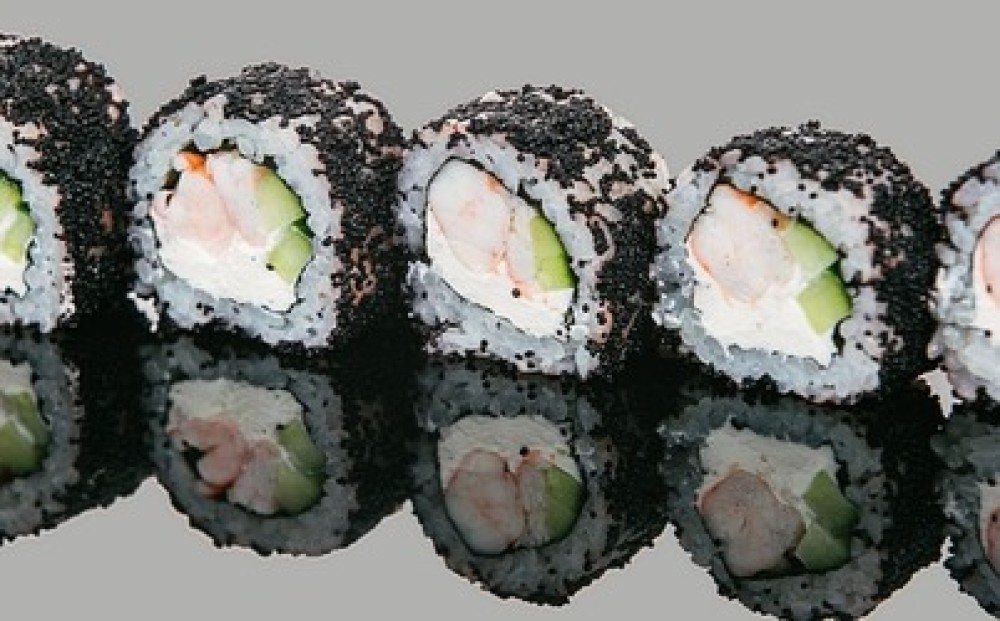Состав: рис, водоросли нори, сыр креметте, креветки тигровые, огурец, икра масаго чёрная. Выход: 270 гр.