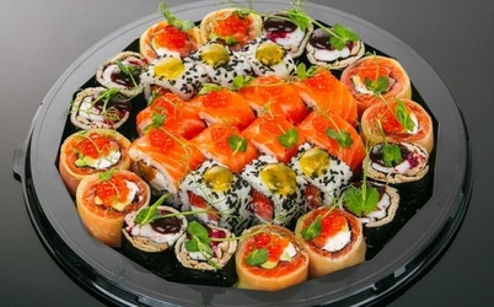 Состав: ролл "С лососем в такуане", ролл "С марлином и креветкой", ролл "Ичиго Сальмон", ролл "Микан Сальмон". (30 шт.) Выход: 950 гр.