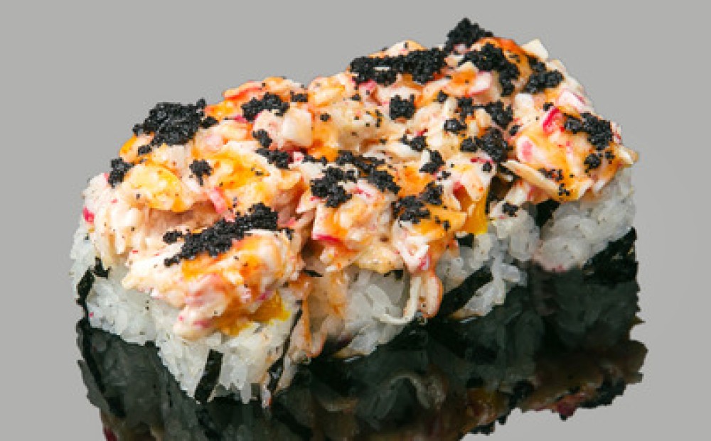 Состав: рис, сыр креметте, крабовый мусс, манговый соус, икра масаго чёрная. Выход: 260 гр.