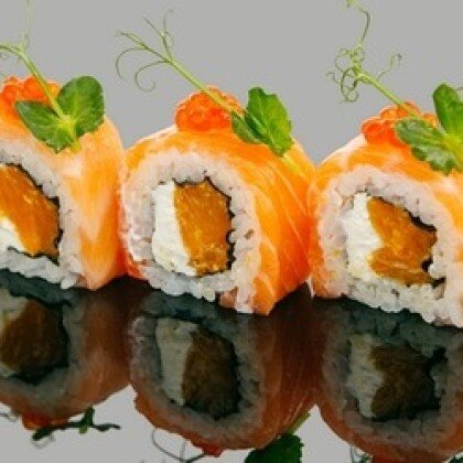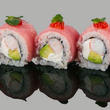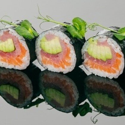 Состав: водоросли нори, свежий лосось, свежий тунец, огурец. Выход: 195 гр.