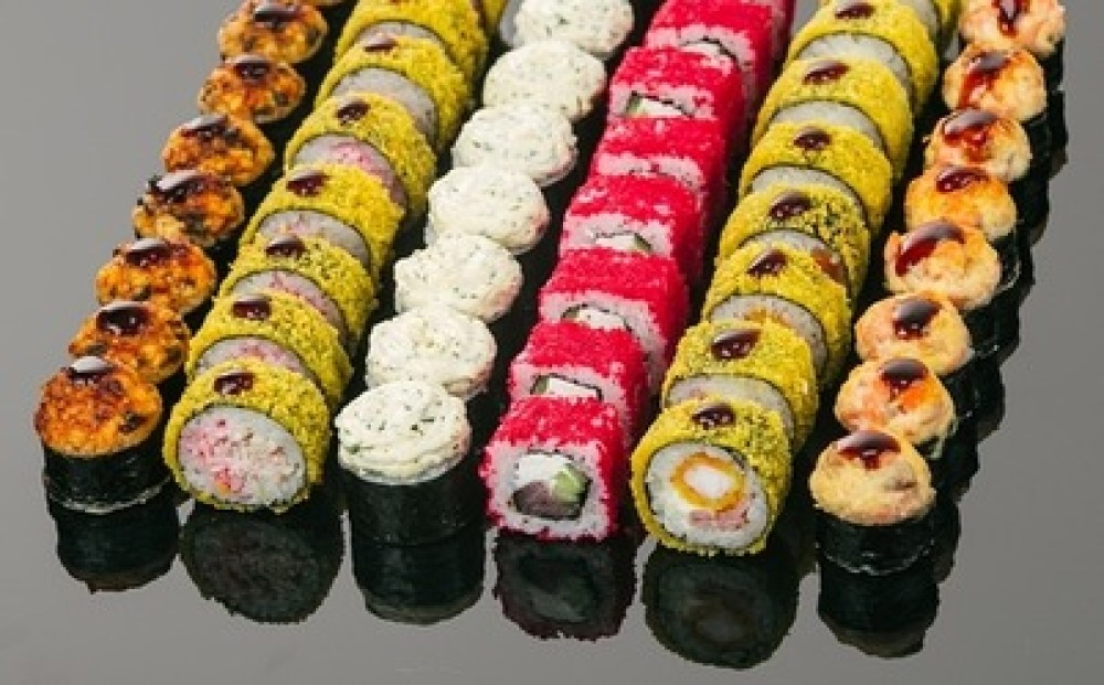Состав: ролл "Запеченный с угрем", ролл "Кобан", ролл "Сёгун", ролл "Карибский", ролл "Запечённый с лососем", ролл "Калифорния с тунцом". (48 шт.) Выход: 1700 гр.