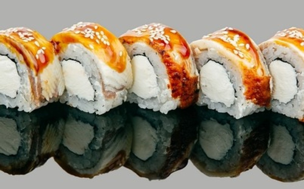 Состав: рис, водоросли нори, сыр креметте, угорь копчёный, соус унаги, семена кунжута. Выход: 250 гр.